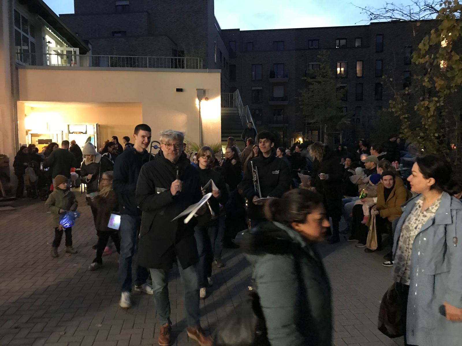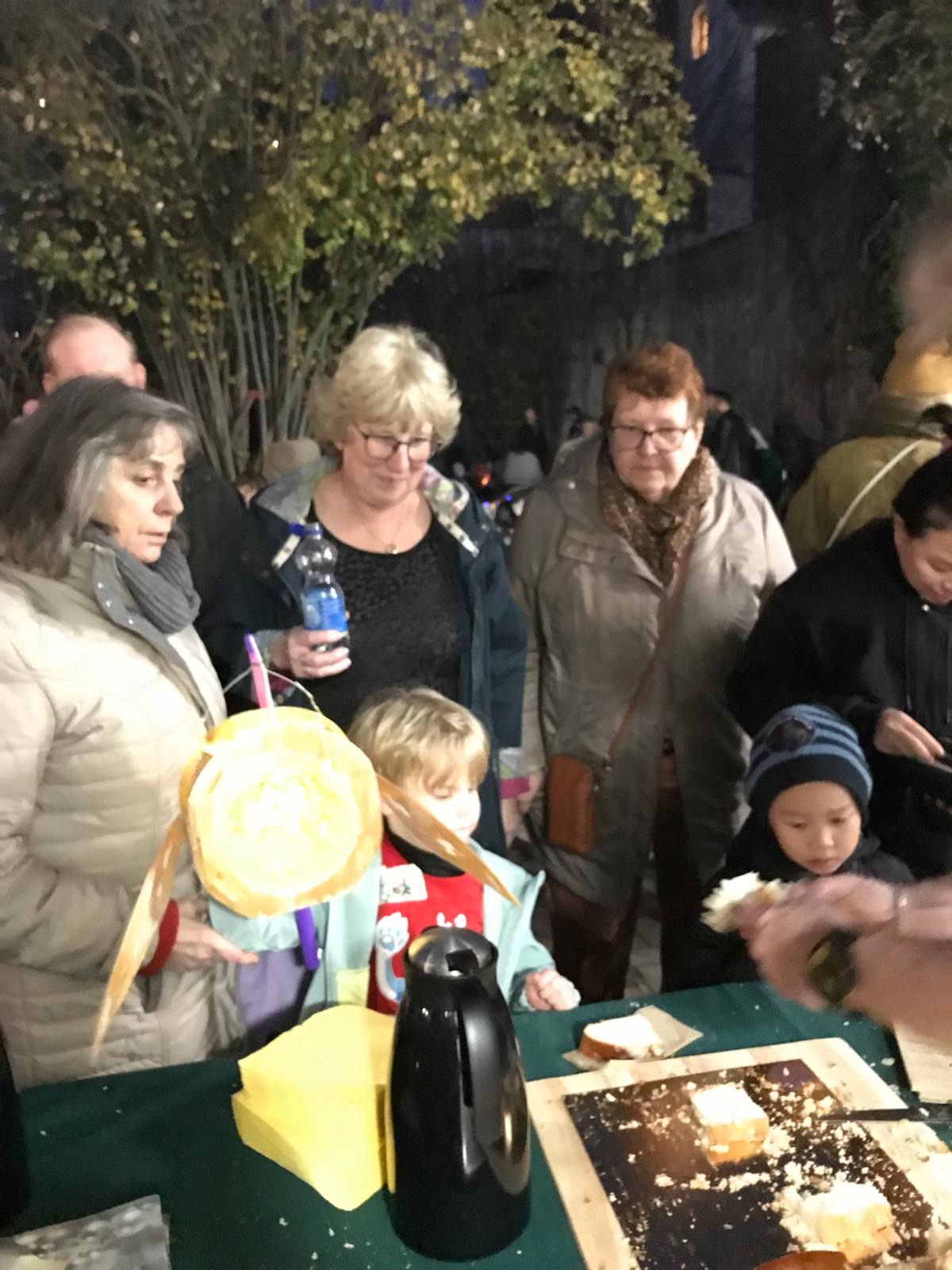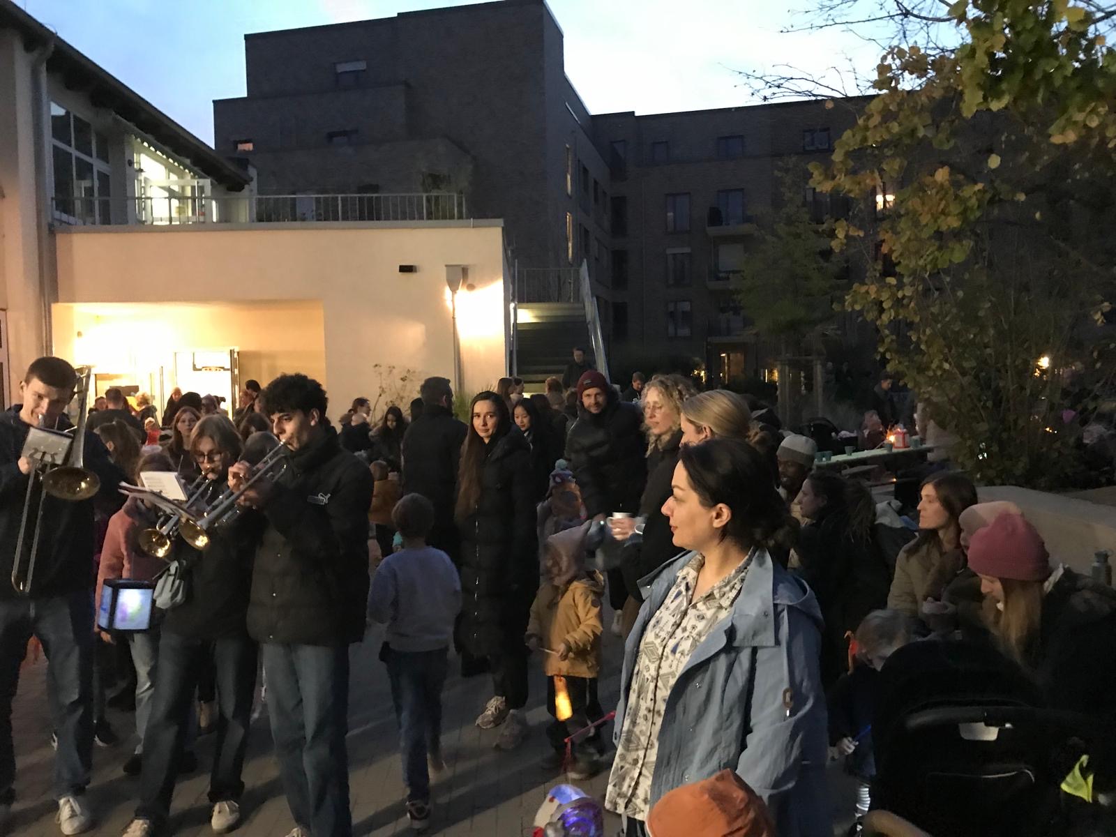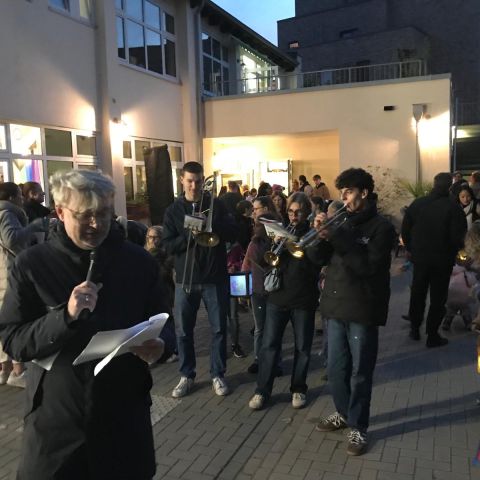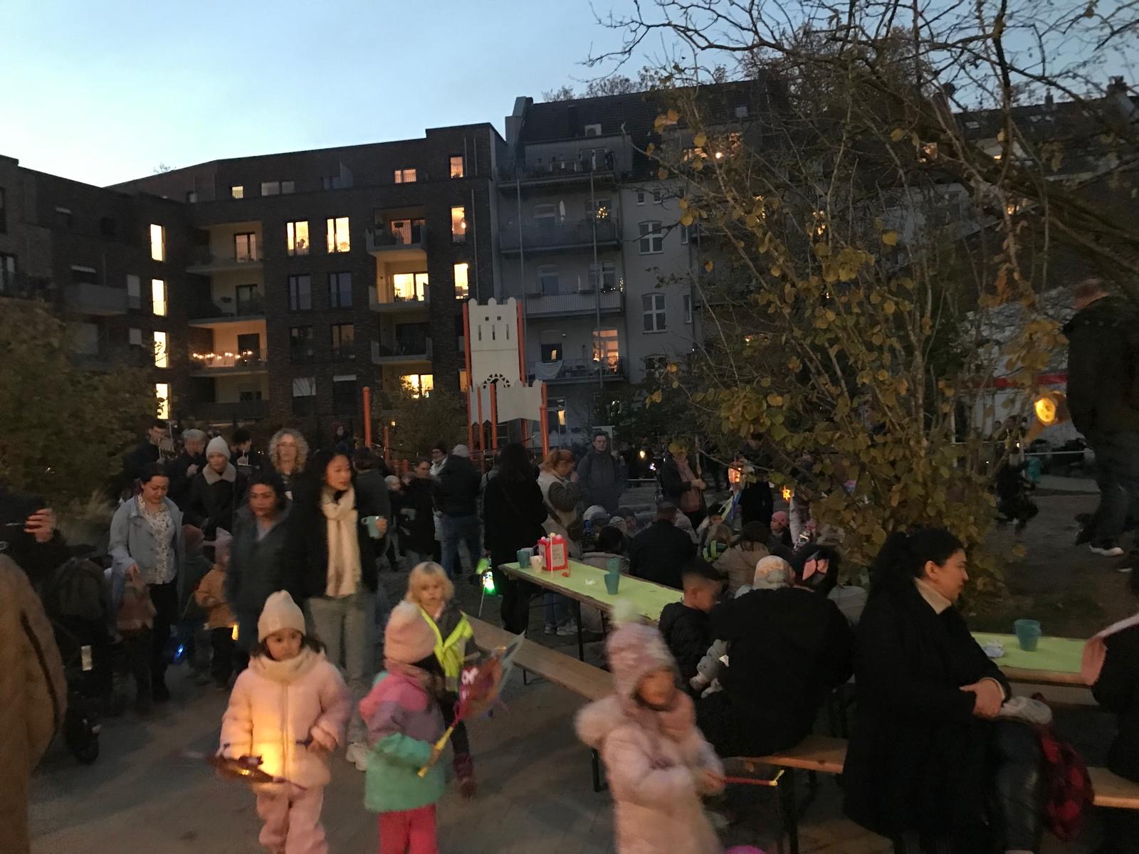 TEILEN lag auch besonders im Sinn der Spieloase – dieses Jahr konnte dank einer besonderen Spendenaktion der Stadtsparkasse Düsseldorf ein weiterer Spenden-Weckmann von 80 cm zur Verfügung stehen. Wir bedanken uns hier auch bei unserer Vereinsfrau, die alle Jahre wieder den großen Weckmann spendet. Die Martinsfeier im Innenhof wurde begleitet von Musikern der Clara-Schumann-Musikschule, die fleissig den Umzug der vielen Kleinen und Großen untermalten. Mit großem Vergnügen konnten alle Kinderpunsch, Kakao, Glühwein, Stockbrot und die Weckmänner genießen und glücklich und zufrieden den Heimweg antreten.