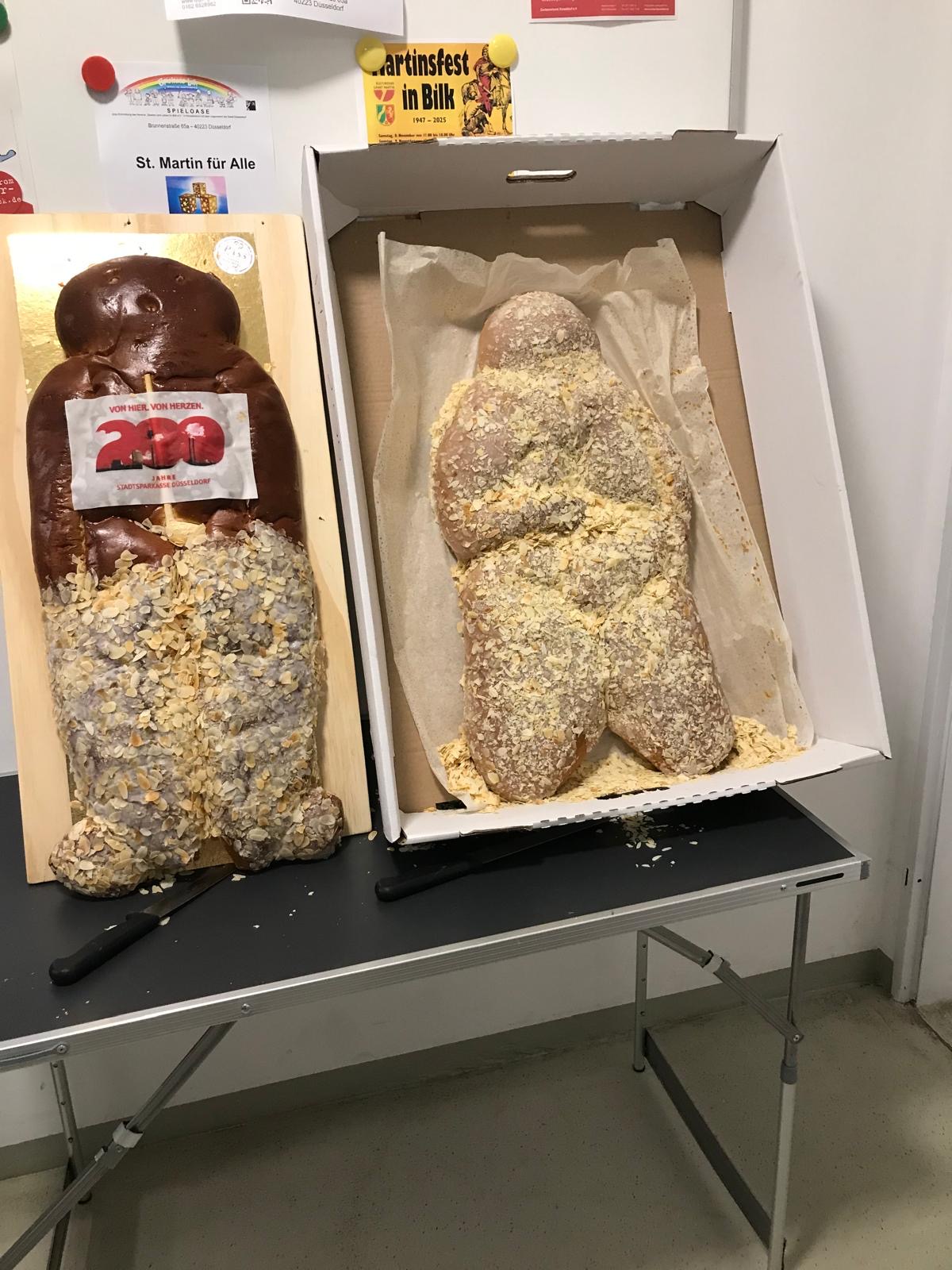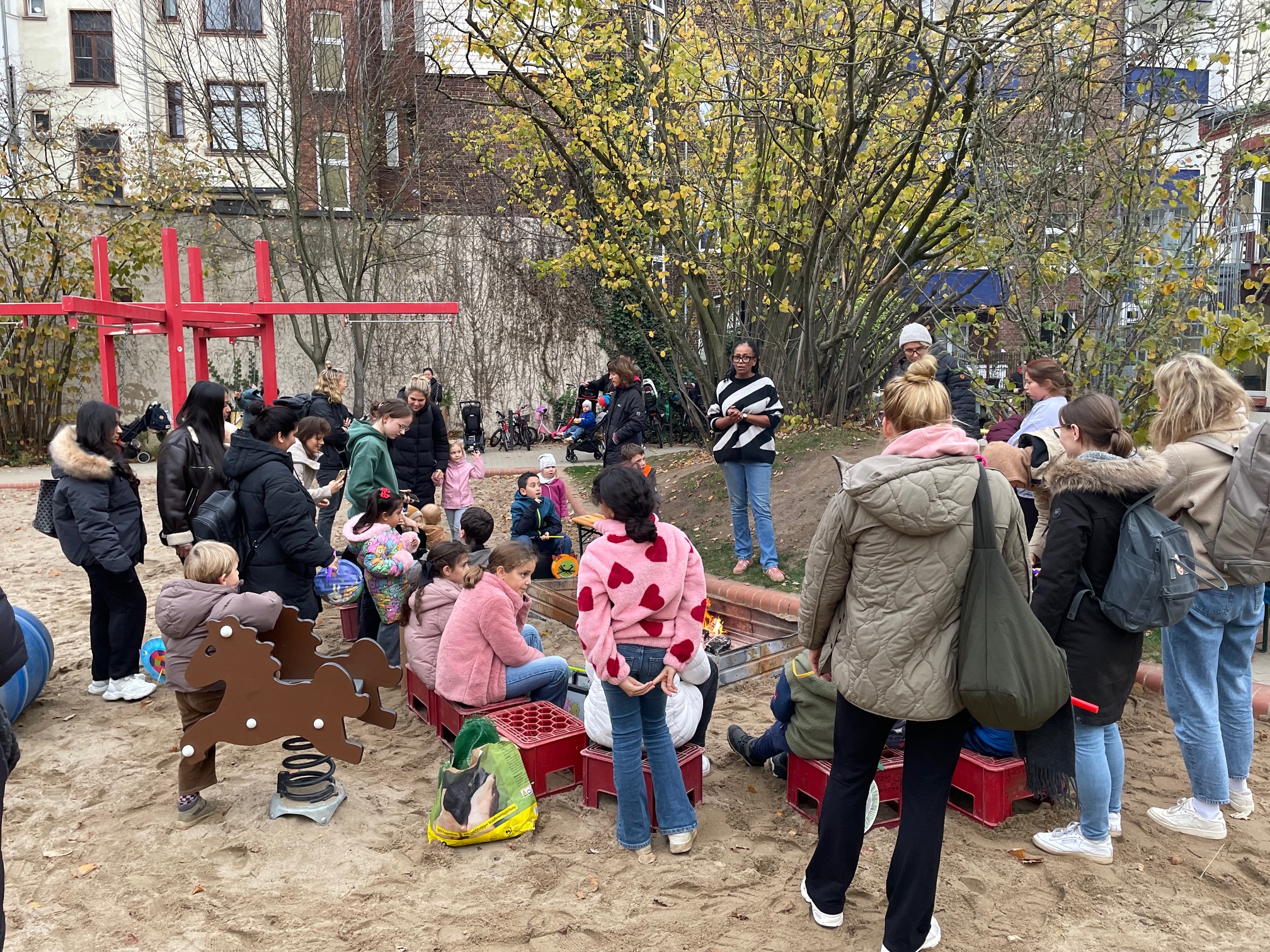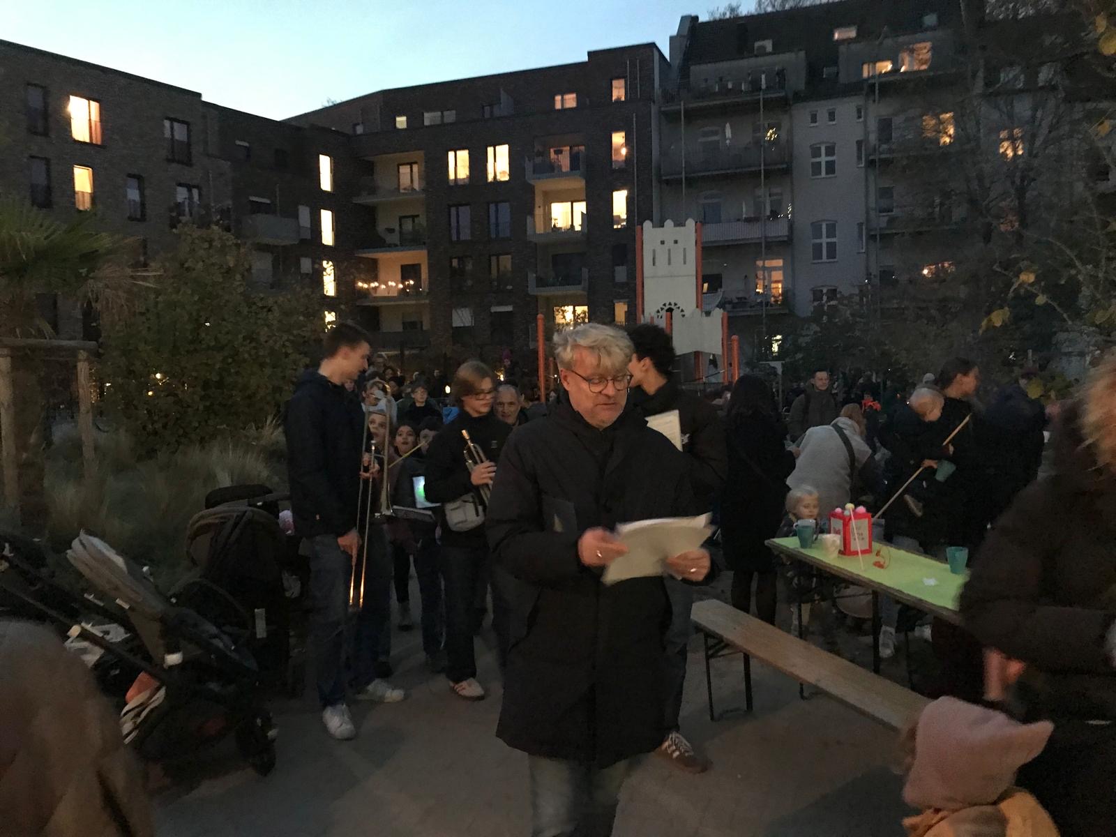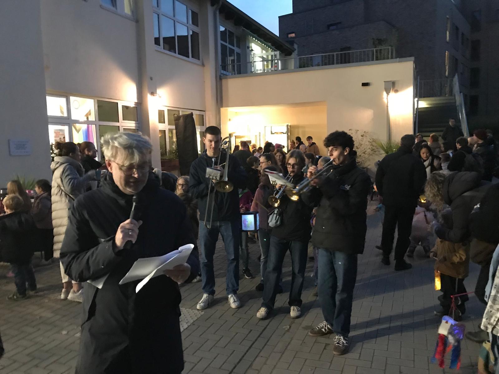 TEILEN lag auch besonders im Sinn der Spieloase – dieses Jahr konnte dank einer besonderen Spendenaktion der Stadtsparkasse Düsseldorf ein weiterer Spenden-Weckmann von 80 cm zur Verfügung stehen. Wir bedanken uns hier auch bei unserer Vereinsfrau, die alle Jahre wieder den großen Weckmann spendet. Die Martinsfeier im Innenhof wurde begleitet von Musikern der Clara-Schumann-Musikschule, die fleissig den Umzug der vielen Kleinen und Großen untermalten. Mit großem Vergnügen konnten alle Kinderpunsch, Kakao, Glühwein, Stockbrot und die Weckmänner genießen und glücklich und zufrieden den Heimweg antreten.