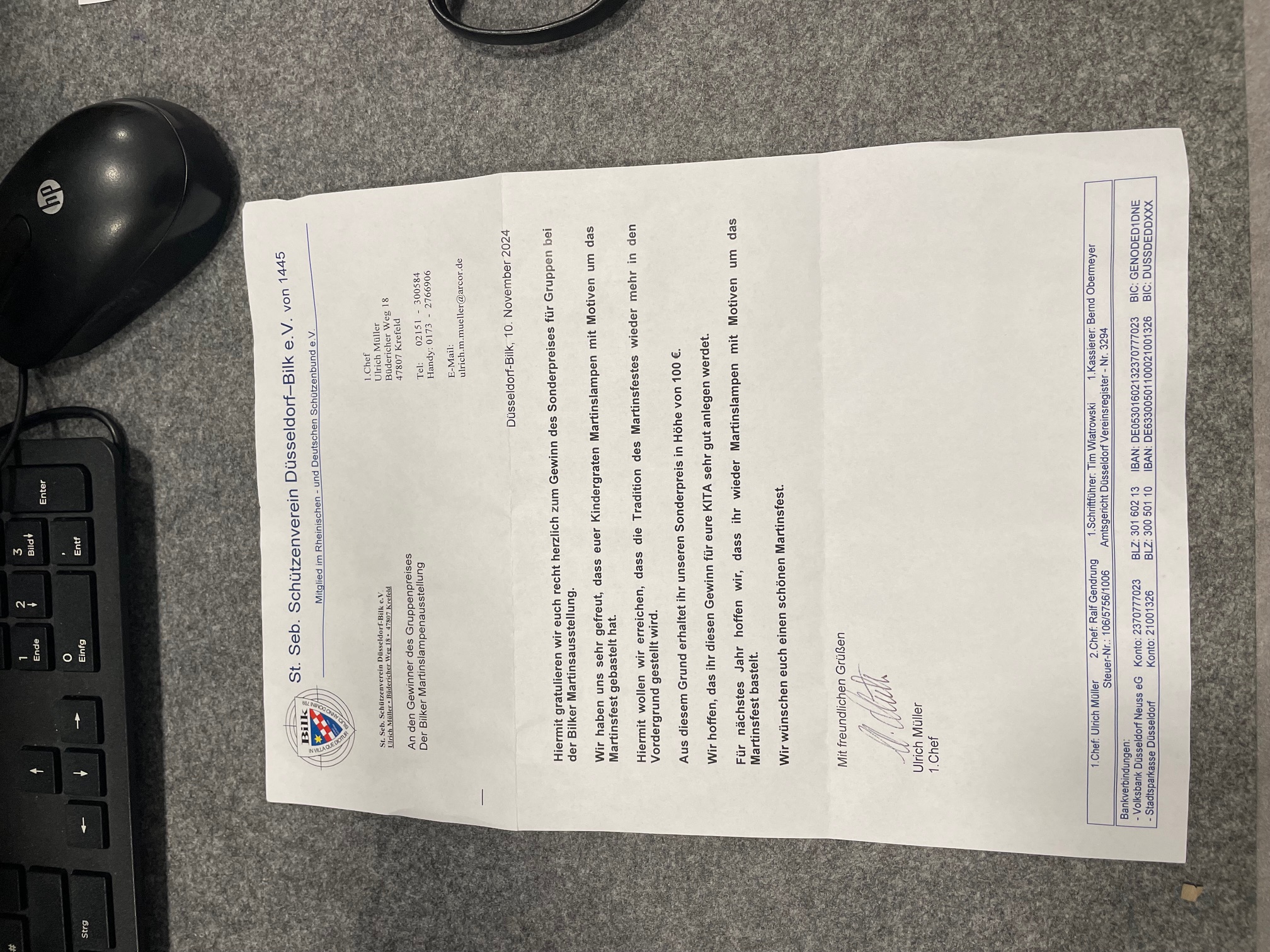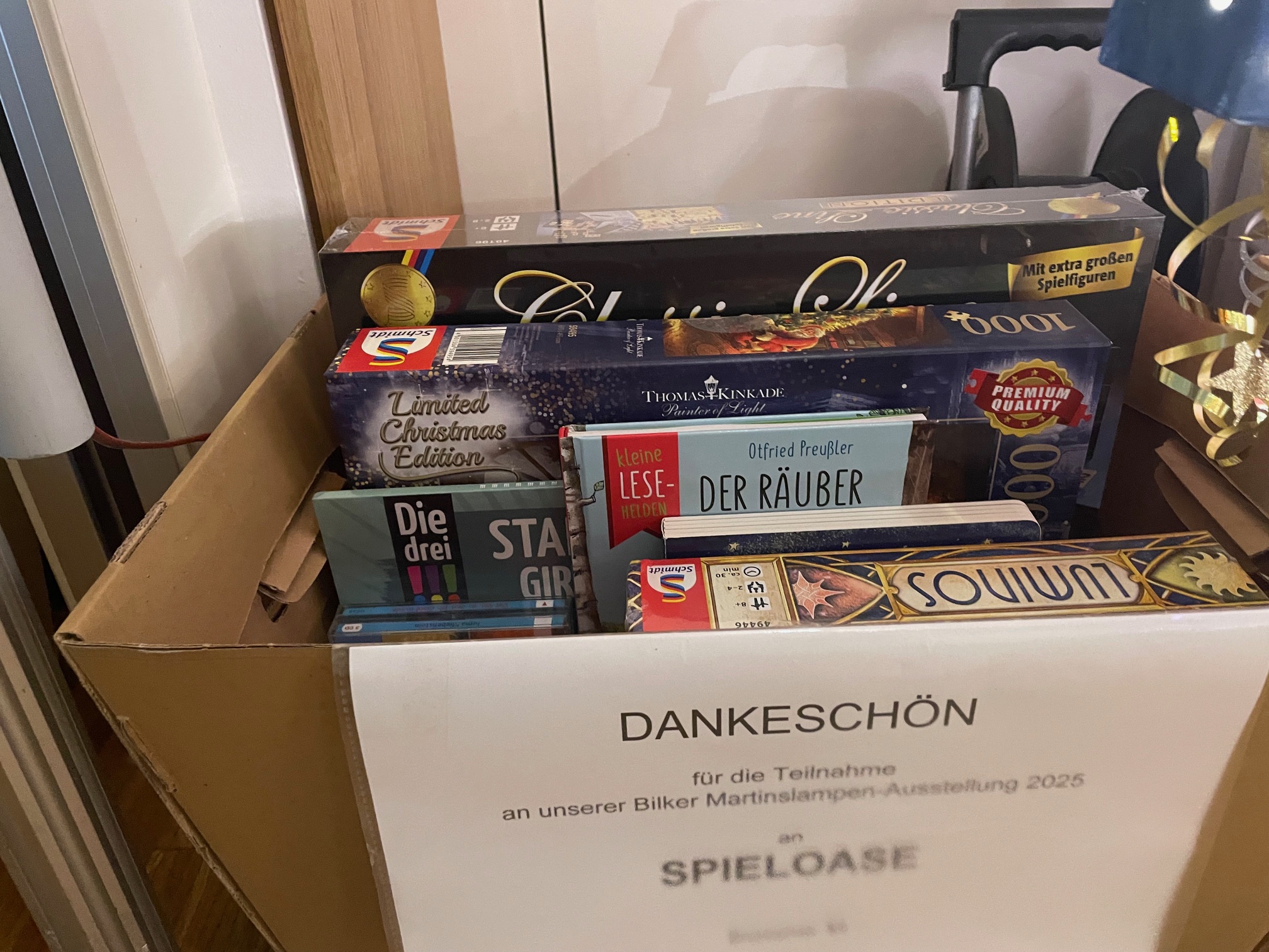 Eine Dankeschön-Kiste mit Spielen und Büchern wurde von den Martinsfreunden überreicht; die Kinder in der Spieloase freuten sich über diese Geschenke. Ebenso groß war die Überraschung über ein Geldgeschenk vom St. Seb. Schützenverein Düsseldorf-Bilk e.V., der sich damit für die eingereichten Martinslampen von Kindern und SeniorInnen bedankten.