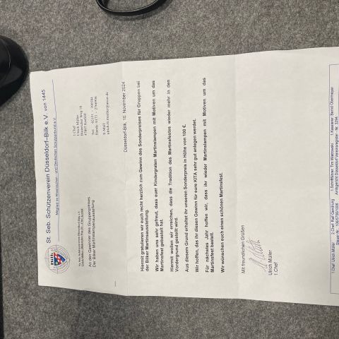 Eine Dankeschön-Kiste mit Spielen und Büchern wurde von den Martinsfreunden überreicht; die Kinder in der Spieloase freuten sich über diese Geschenke. Ebenso groß war die Überraschung über ein Geldgeschenk vom St. Seb. Schützenverein Düsseldorf-Bilk e.V., der sich damit für die eingereichten Martinslampen von Kindern und SeniorInnen bedankten.